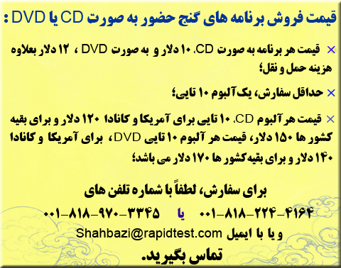 To order please contact in USA: Tel (Parviz shahbazi) : 818-970-3345 E-mail: parviz4762@mac.com Address: P.O.BOX 745 Woodland Hills, CA 91365