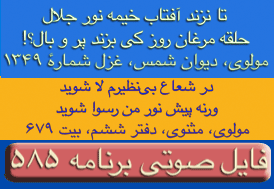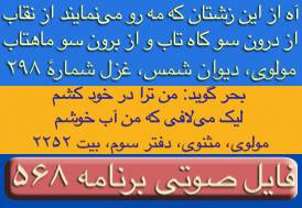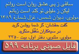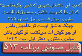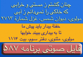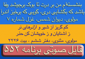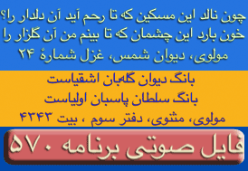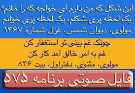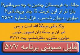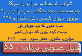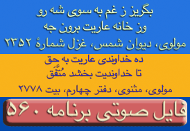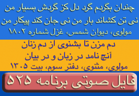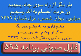 ای غم ار دم دهی از مصلحت آخر کار - دل پر آتش ما قابل دم نیست برو- دیوان شمس مولانا-ترجیعات - پنجم. چقدراین بیت واشعاری که یکی از آقایان بیننده درپایان این برنامه قرائت فرمودند زیباوتاثیر گذاربود. نتوانستم تمام شعررایادداشت نمایم ولی مظلع آن به این شکل شروع میشد: چندی است که حال من بسی زارشده است --چون دم دمه هایم بدوبسیارشده است --بشکسته سکوت من وهرلحظه ..... این برنامه نیز بک معجزه است