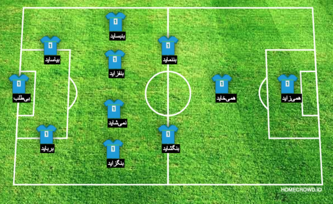 در خط حمله ما دو مهاجم داریم به نامهای «همیزاید» و «همیخاید». مهاجم «همیزاید» به عنوان مهاجم نوک بازی میکند و مهاجم «همیخاید» با کمی فاصله در عقبتر او را حمایت میکند. در پشت مهاجمان دو هافبک داریم که یکی هافبک چپ به نام «بننماید» و هافبک راست به نام «بنگشاید» میباشند. در خط میانی بازیکنان «نمیشاید»، «بِنَبساید»، «بِنَفزاید» و «بنگزاید» هستند. در خط دفاع هم تنها دو مدافع داریم به نامهای «بیاساید» و «بربایَد».